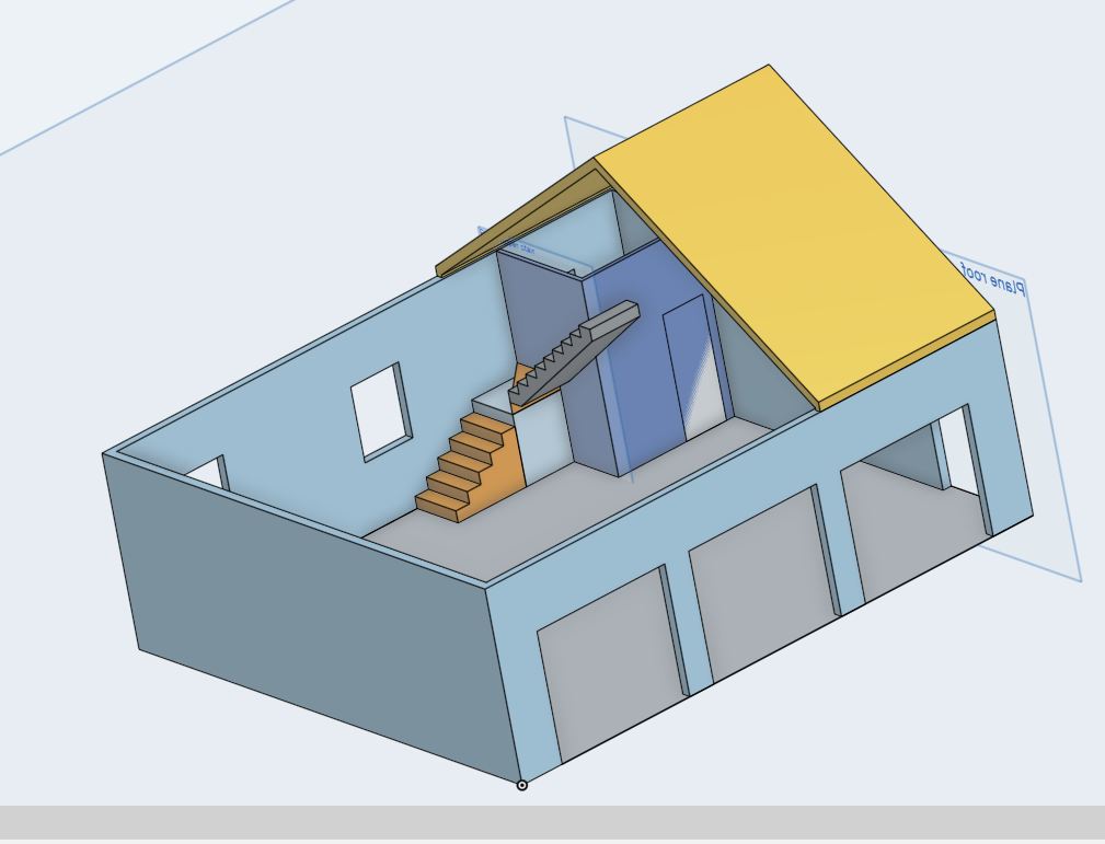 A little playing trying to figureout what to do about stairs....I think I got it. As shown the last step is up onto the the floor upstairs. Because I already butied plumbing in the concete the bathroom wall needs to stay where it is, which means the stairs come up about 1 foot from the end wall....not too bad and it needs a little space for a door anyway. Also because of head room I can't come right to the outer edge of the floor, I need to be 16" into the room......again not too bad. I only need to cut 1 truss which is good. It shortens the middle bay by 3ft and the front of the landing is 4.5ft so a car will easily drive right up to it. I can put the floor heat stuff under the landing.