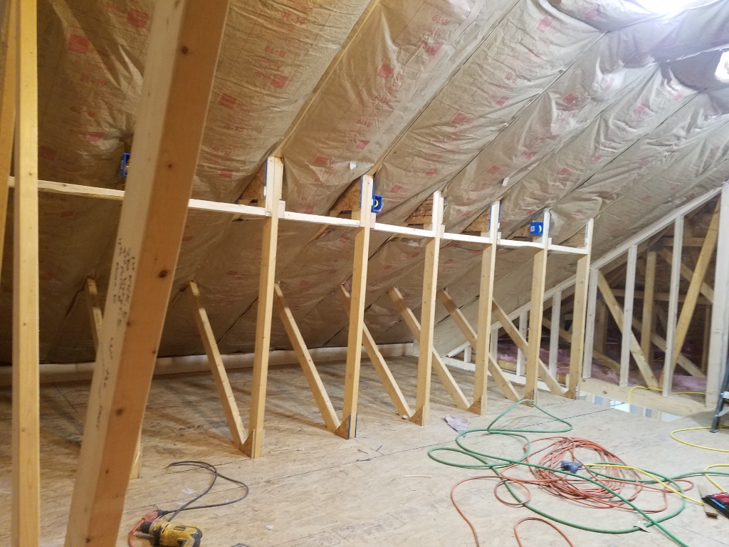 The hidden room at the end I told the kids I'd build them has been kicking my butt....but I think I'm finally winning. I have function if not pretty framing, insulation and drywall going up. My plan is to move this to mud before I start insulating and mudding the rest of the space so its basically finished before its sealed up and be imes a small room with poor ventilation. I left the studs out of the dividing wall so I could get the drywall in there, the framing is done everywhere else upstairs.