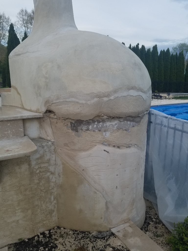 I had at mine with a grinder yesterday. The plan is to use fiberglass tape and acrylic bonding agent on the oven and in the stucco base to patch the cracks then a fresh coat of color on the whole thing so its back to looking new.