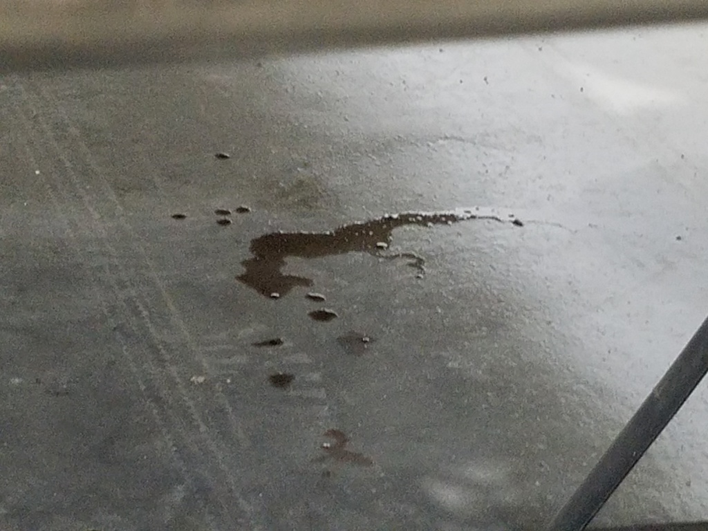 Shes got an oil leak....at leak it wipes easily off the sealed floor :)