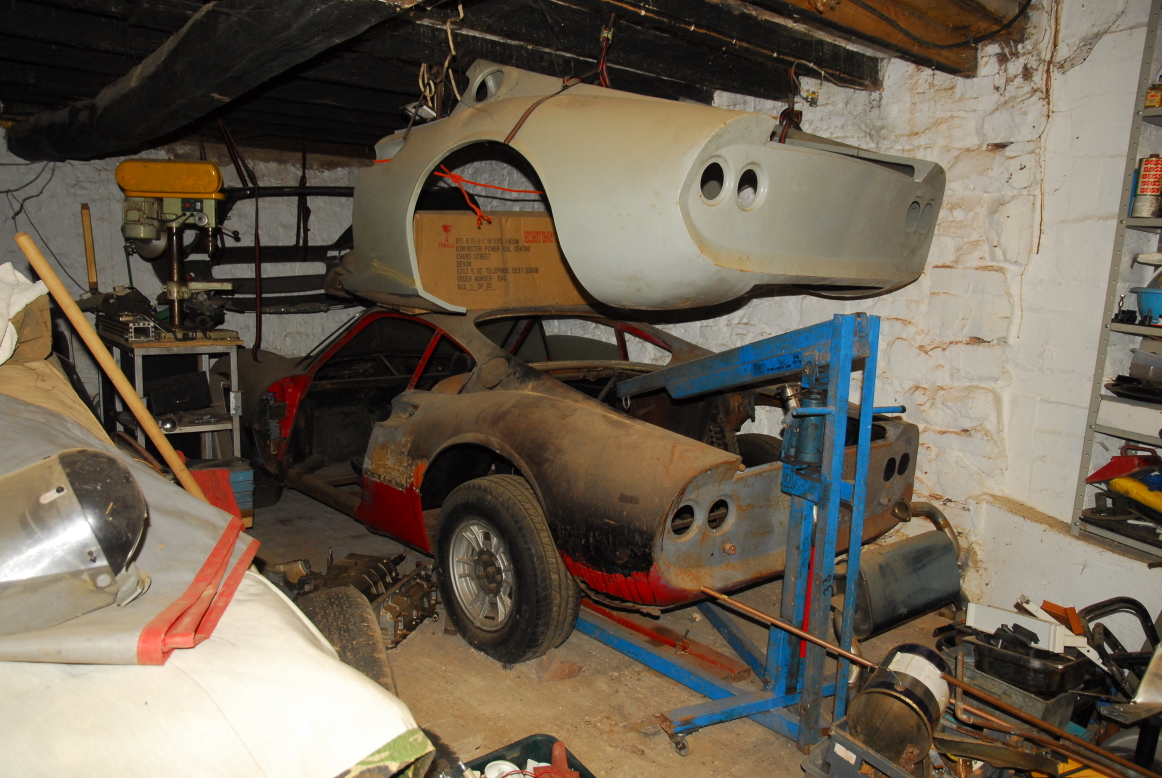 Further to the request for a photo of the Dino, here is a shot I took of it a couple of minutes ago, hiding in the furthest recess of my garage. As can be seen, the new front and rear clips are hanging above it, and most of the glass is in the box on the roof. You can also see that I wasn't kidding when I said it was derelict...