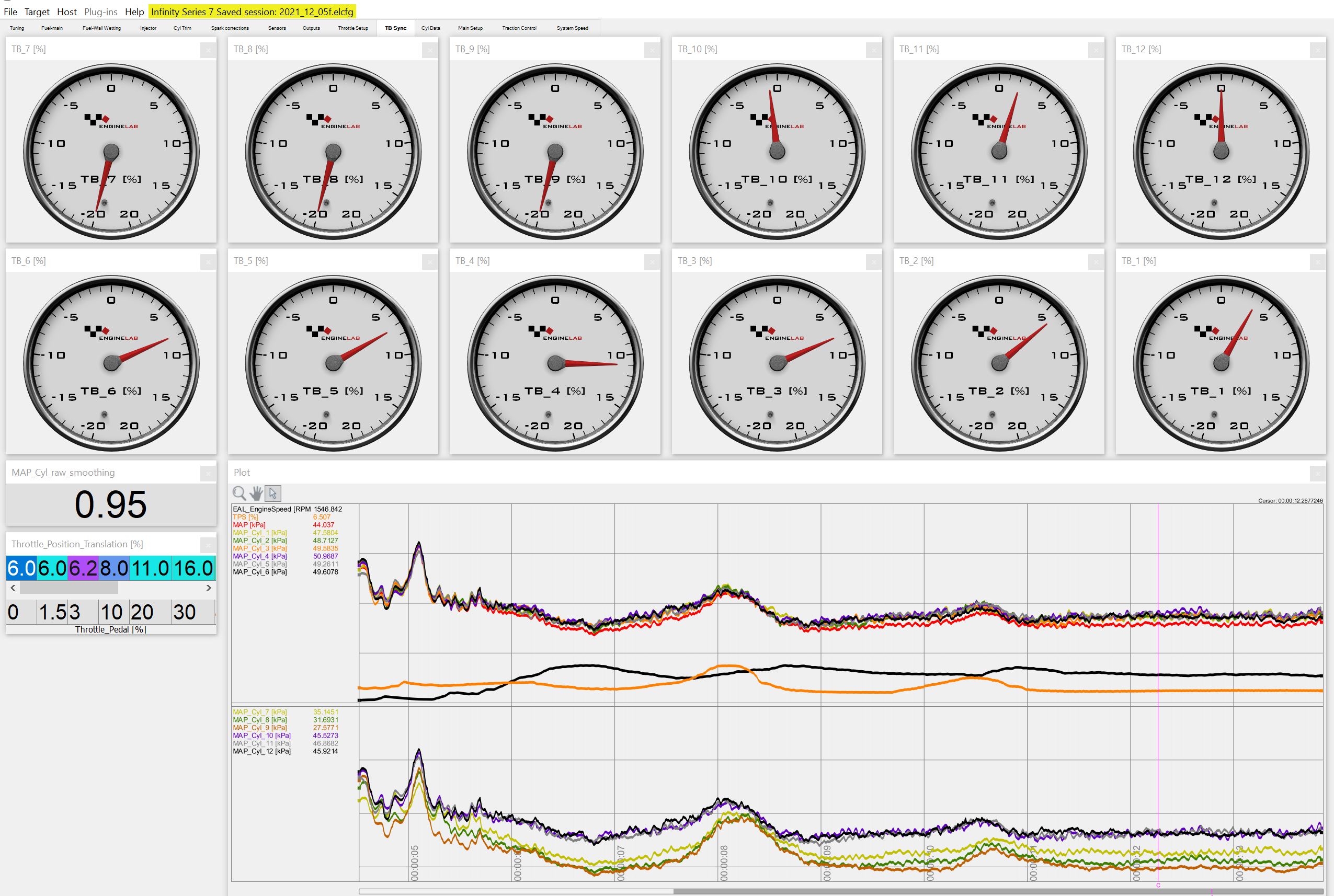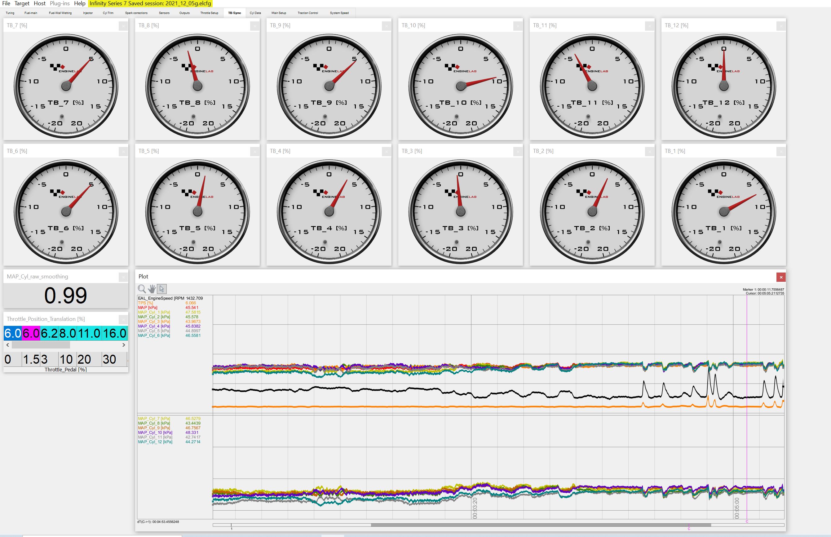 the graph below are the cylinder MAP reading that run the gauges....this looks to be working pretty well now so next run I will turn on the cylinder corrections and TBs sync'd or not each cylinder should get the same mixture.....at least that is how I THINK the code will work. With the TBs kind of matched now I should be able to get on with fixing the mixture.