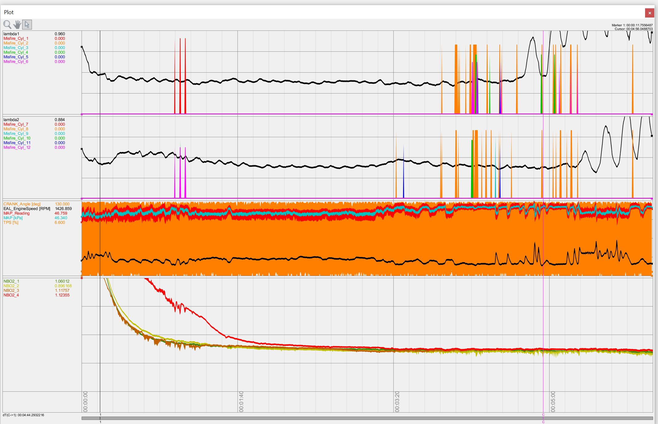 I have a misfire function I'm playing with too....and it looks like its sort of working. It shows clean in the middle where I know for sure it was running well and lots of color at the end where for sure the plugs were again all loaded up and things were shutting down so helpful if not perfect I think. With the TBs kind of matched now and the misfire tool to tell me if I can trust the O2 readings I should be able to get on with fixing the mixture.