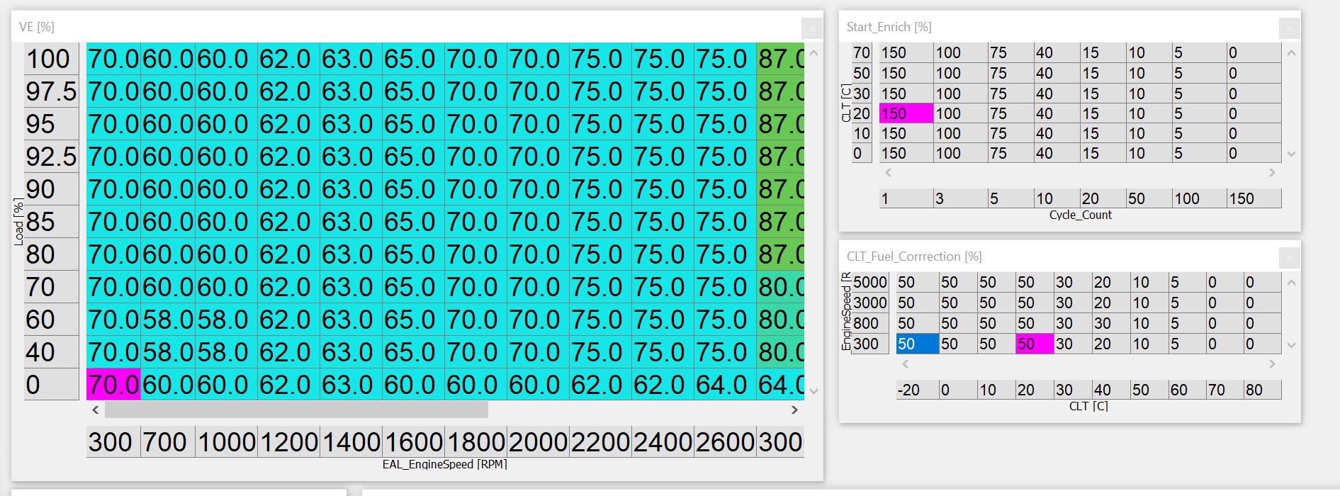 What I have is 3 tables. There is the main VE table and on the left it a 300 rpm column. This cranks at 150 so that the 70% is what is used until its running I was originally planning idle at 1000 and stall saver setting at 700, I need to move those. Also I wasn't expecting the 45kPa idle or quite sop linear a MAP so I have too many MAP rows up top and not enough down low. There is no limit to how many row or columns I can add to a table in this ECU but I like to be a bit strategic so I don't waste time tuning stuff that doesn't matter and need to move some stuff around. But for starting is the 1 row on the left.