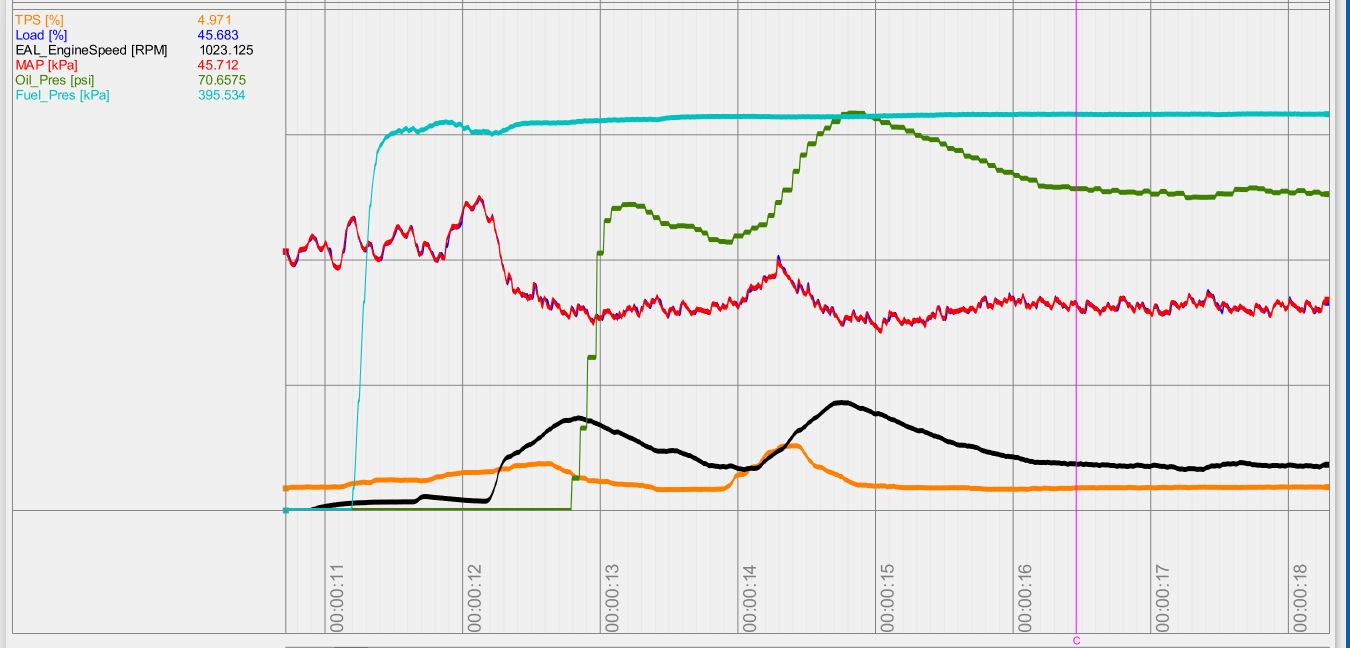 I still have a way to go on cold starts and that takes quite a lot of time. Also I'm not sure if the way I set up the ECU up for this is a good idea or more trouble than its worth. This is the last mostly cold start, CLT was 30C