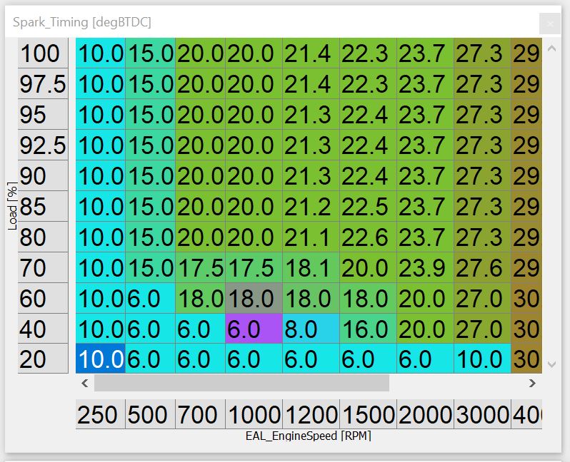 I'm also using spark timing for start and then idle which kind of buggered some of my earlier startup fuel settings. Same as the VE table, cranking is the 1 column on the left. It kicks back if I go above 10 degrees but then once it starts I need to pull the timing back or I can't get the rpm below 1800 or so. I need to add of resolution around idle but right now I start pulling timing at 2000 and below and hold ot steady around idle rpm which is the only way I've ever found to get a nice steady idle like in the video I posted.