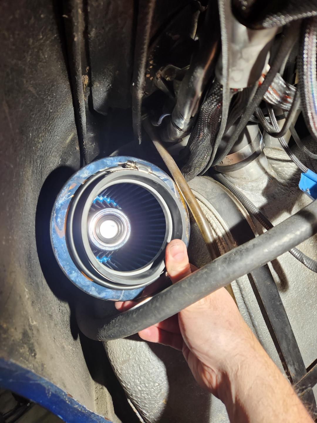 My plan is a fiberglass housing that fits over the filter and fender flange to connect it to the now larger duct.  I taped up the filter and spray foamed....but I had no where near enough.  Tomorrow