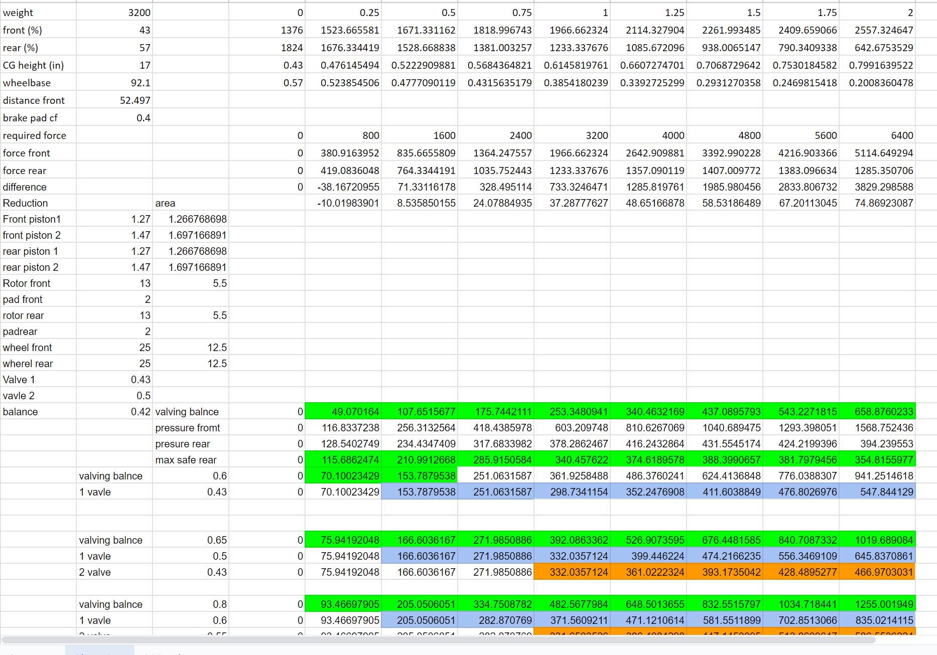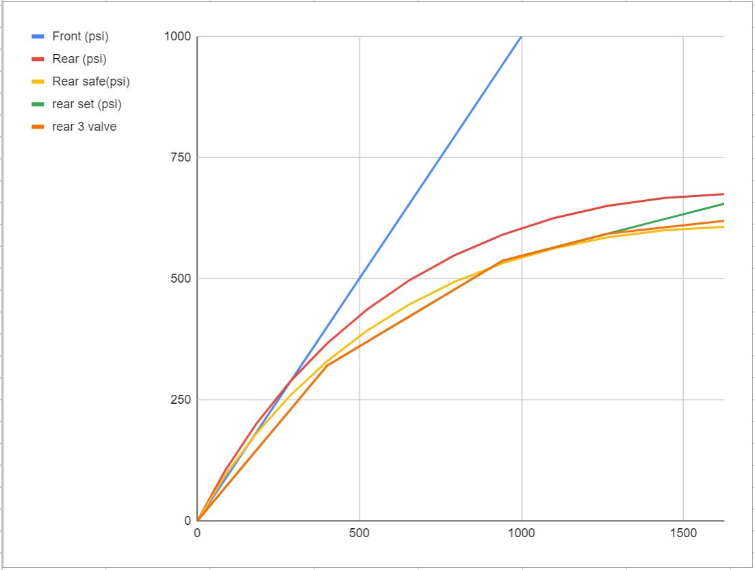 I played some more and fixed a couple not quite right calculations. It looks like 5/8 and 0.7 masters are about perfect then the 50% valve then a 57% valve, and a 3rd 57% if I'm in the mood for perfection, but it does seem like if I can have 13 MAP sensors I should be able to have 3 proportioning valves :lol: . The pad cf messes with the valve setup because they work on pressure and pad cf changes system pressure.....so the spread sheet tells me where to set everything for what pad cf number.
