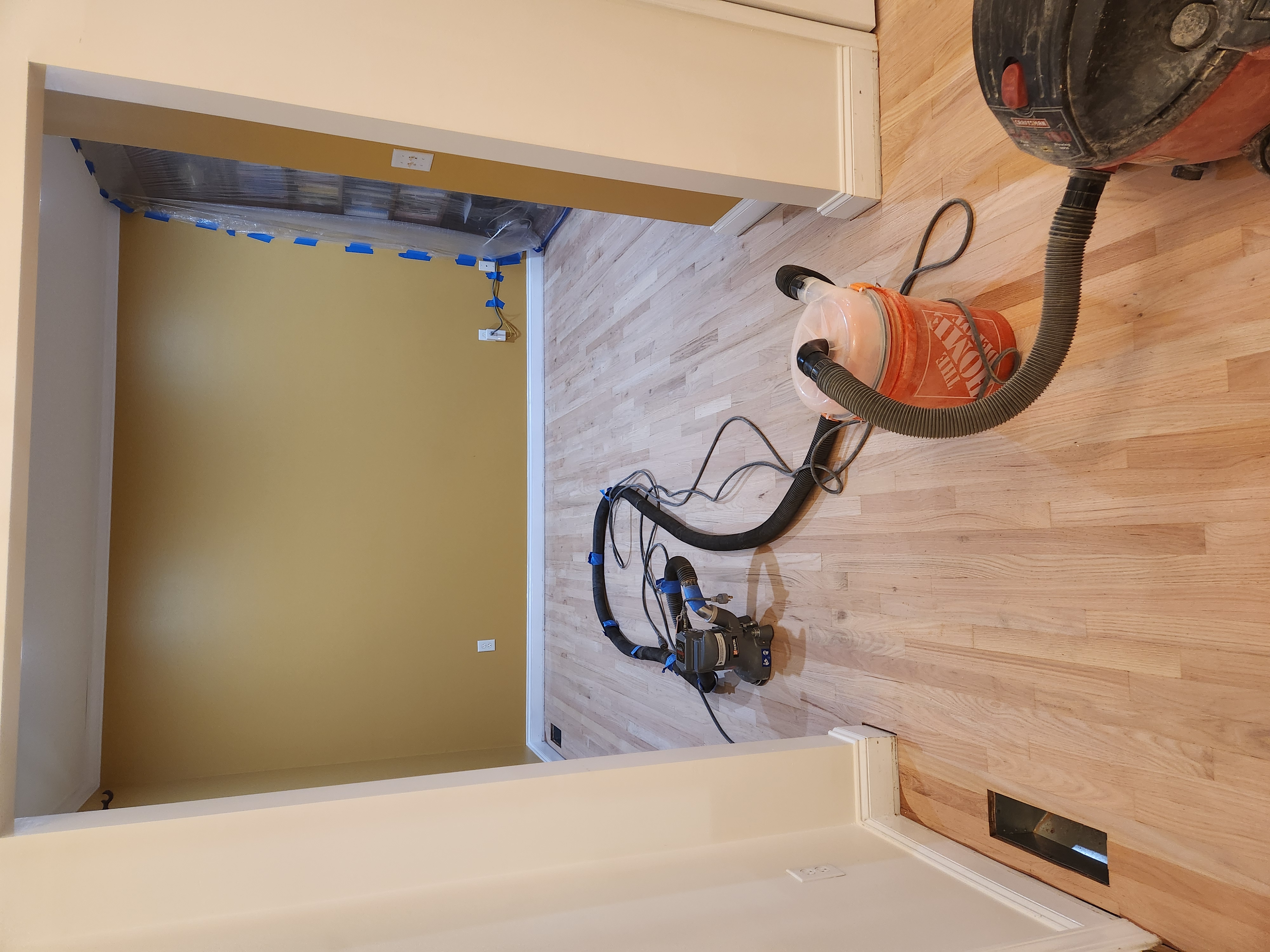 Then a defect inspection...fill anything that needs it, blend out any dings. Then 2 applications of a 2 step product (so 4 coats) called red out that gets rid of the red from the red oak. Dry 24 hours but that is a water base that raise gain so next a VERY light sand by with the 5" and 150 grit taking care not to get back into the red. Then a sealer that prevents the poly from getting into the wood and bringing up it's colors, then 2 layers of a catalyzed commercial poly (which is basically 4 coats of normal poly) with a 150 grit sand between coats and it's a "natural" floor that is anything but natural.