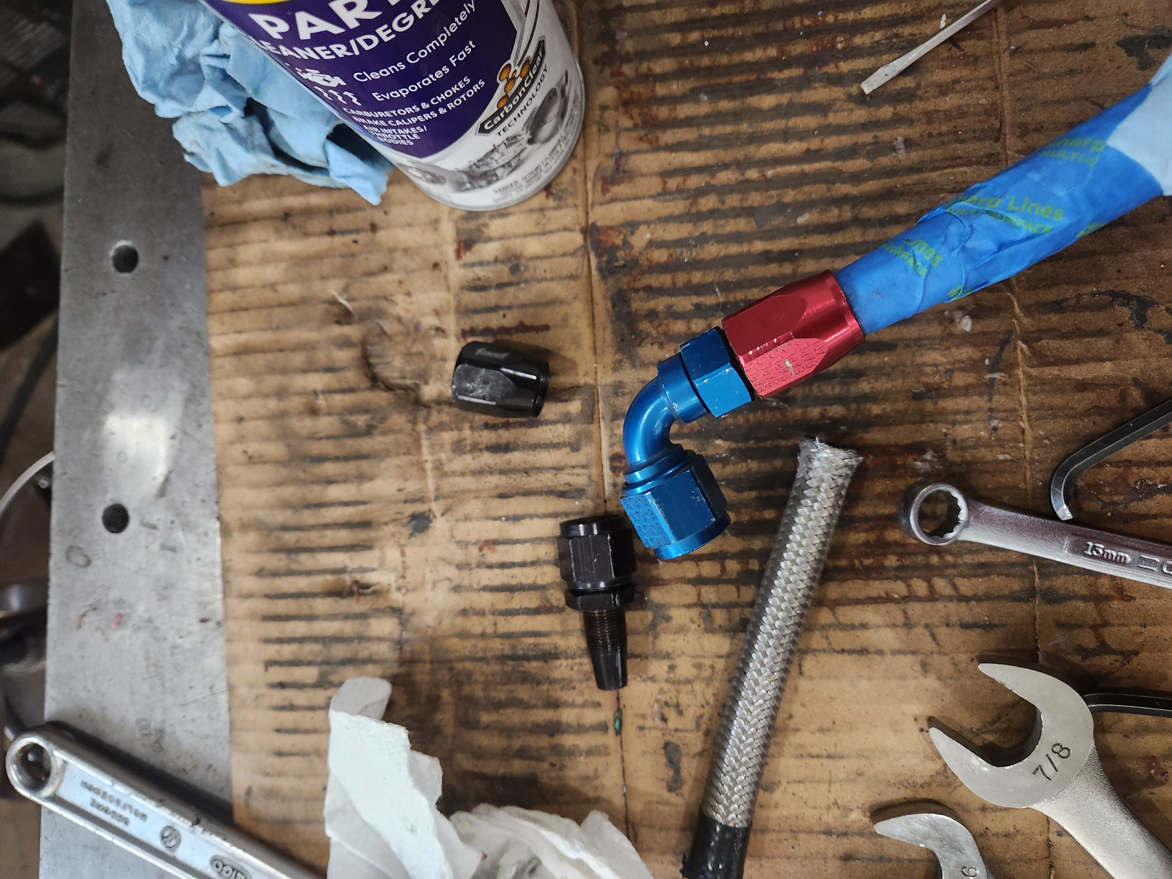 Step 1, the air box. When I fitted it last time I just removed the fuel return hose with a plan to relocate it at a future date....which was today. I found a fitting that would work but in the wrong color so "for now" I used it anyway, spray painted it the right color and setup the the hot air gun to speed up the drying.