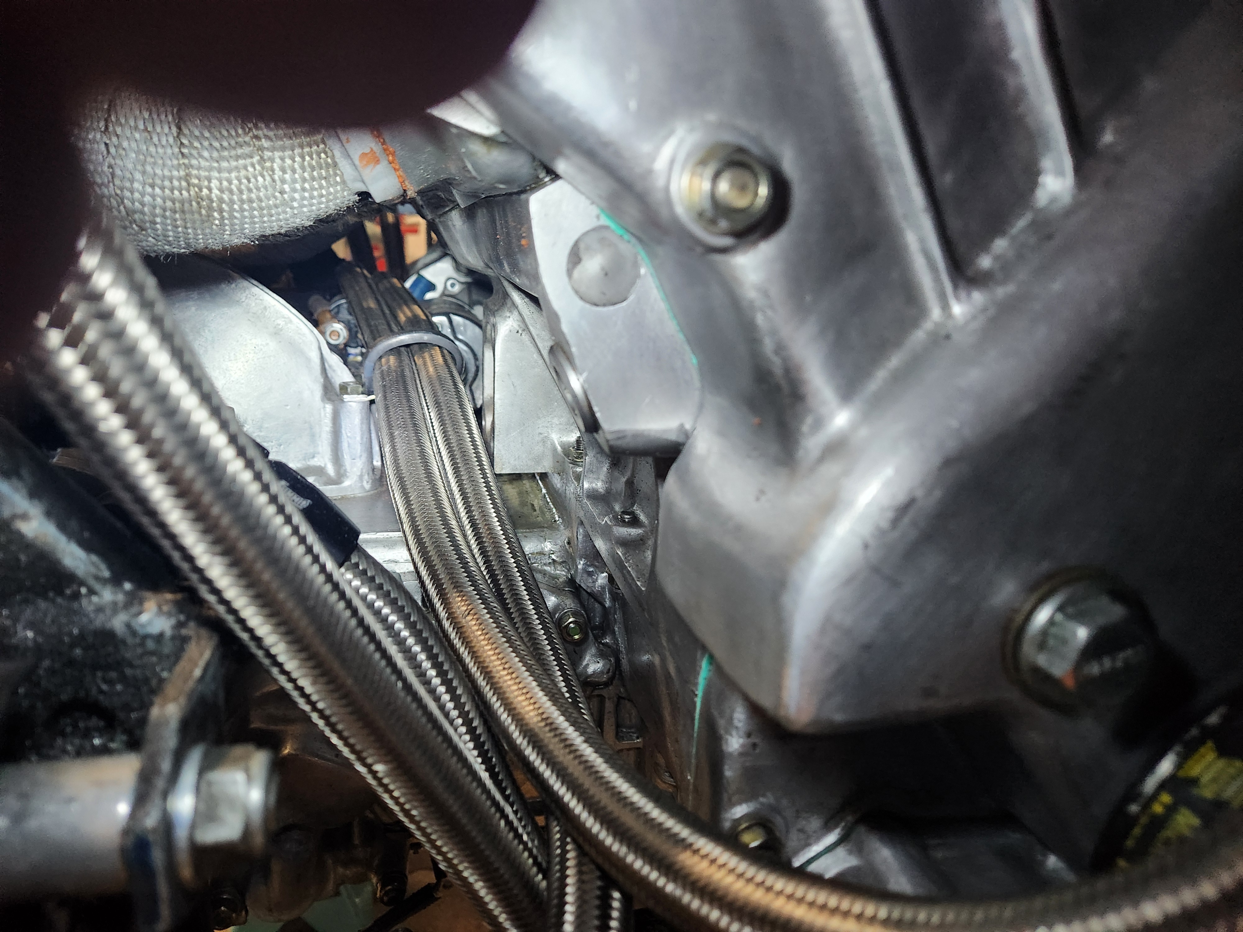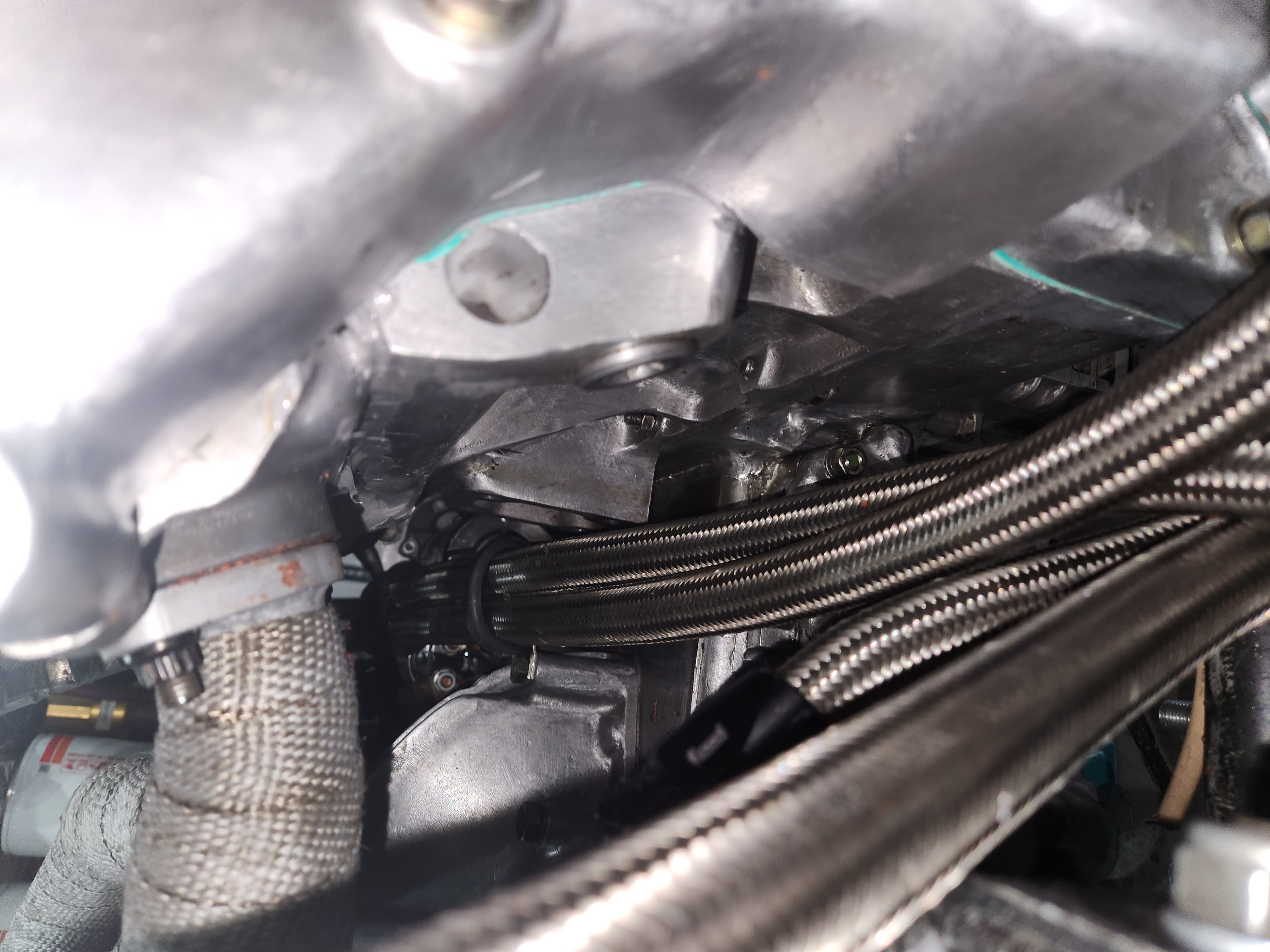 The good news though is its leaking differently so for sure I disturbed the leak. Its wet above my RTV on the left side of the bung so probably a weld on the metal I added to form the oil passage. Above the header flange its dry so I can probably slather on some more of the orange RTV to seal the leak and hide the mess with the header. Tomorrow problem
