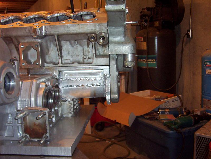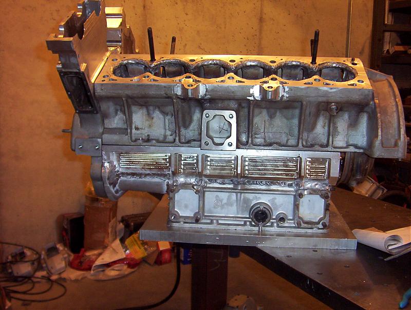 The more you pre-heat the less distortion you should get…at least in theory but any time you weld anything the only thing you can count on is that it’s going to pull in the weld zone. The block is out .010” down the main bearings and will need to be fixed by either oversize bearings or welding up and re-cutting the journals. Also on the front face of the block it’s pulled in around the bores and I’ll need to weld up the surface and re-cut it. I think the trans is ok so far because the precision stuff is far enough anyway from where I’ve been working, but I won’t know for sure until I get it off the jig and check it.
