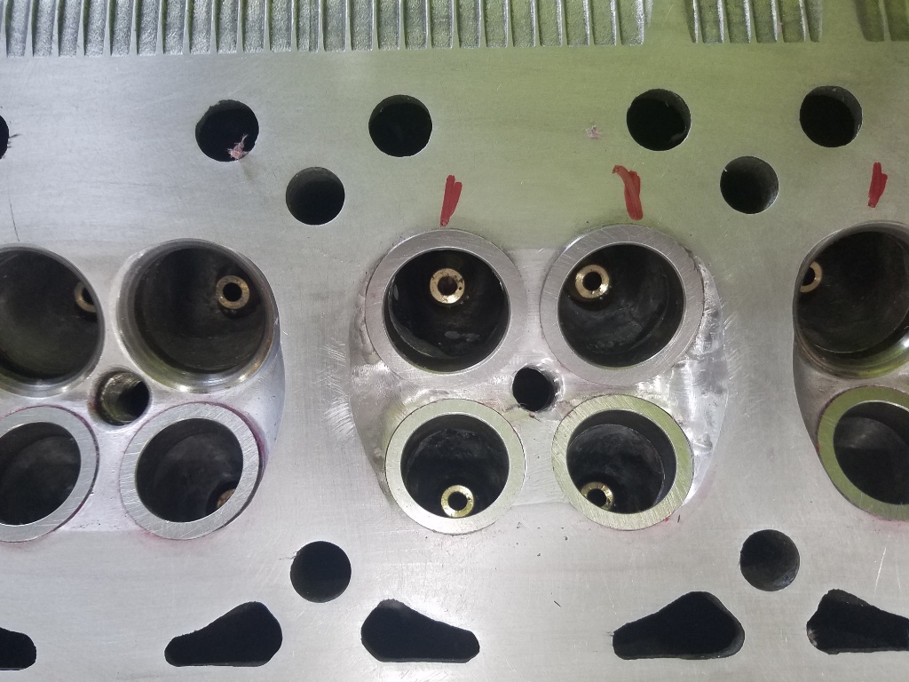 I decided to start on intake casue there were way less to cut, just the 2 from the smashed chamber and 3 more where I replace wonky looking guides and it was the wonky guides that seemed to cause the issue. ! head only needed 1 seat cut so thats where I started and had to cut about 30 off to clean it up because the best I can tell the wonky looking guided was just what it appeared and the center hole was angled. When I cut the seats I put a 5mm pin in the guide and indicate it true at about the seat position so a slight wrong angle somewhere can't result in a valve that doesn't sit on its seat. Then I replace the guide with a straight one which shifted the hole location a few thou and BAM, it can't be cleaned up without really sinking the valve and will need to be replaced. i't will be 2-3 weeks before I have another seat I'm guessing. In the pic, just above the red there is a more greyish area (from a quick lap) that is there towards the bottom and gone near the top right....that is where the valve is supposed to seat and clearly can't.
