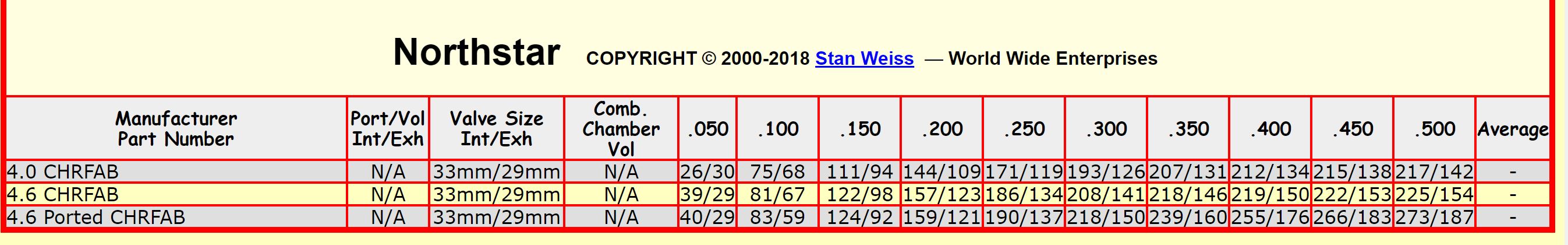 CHRFab is the outfit that did most of the speed parts for the Northstar. If they were still in business I'd have ordered their craziest porting package and called it a day. Alan Johnson retired, though. I already have their valvesprings--which are adapted from another application, not custom wound--on my heads. So your graphic that shows them as the MFG is showing already ported flow numbers.
