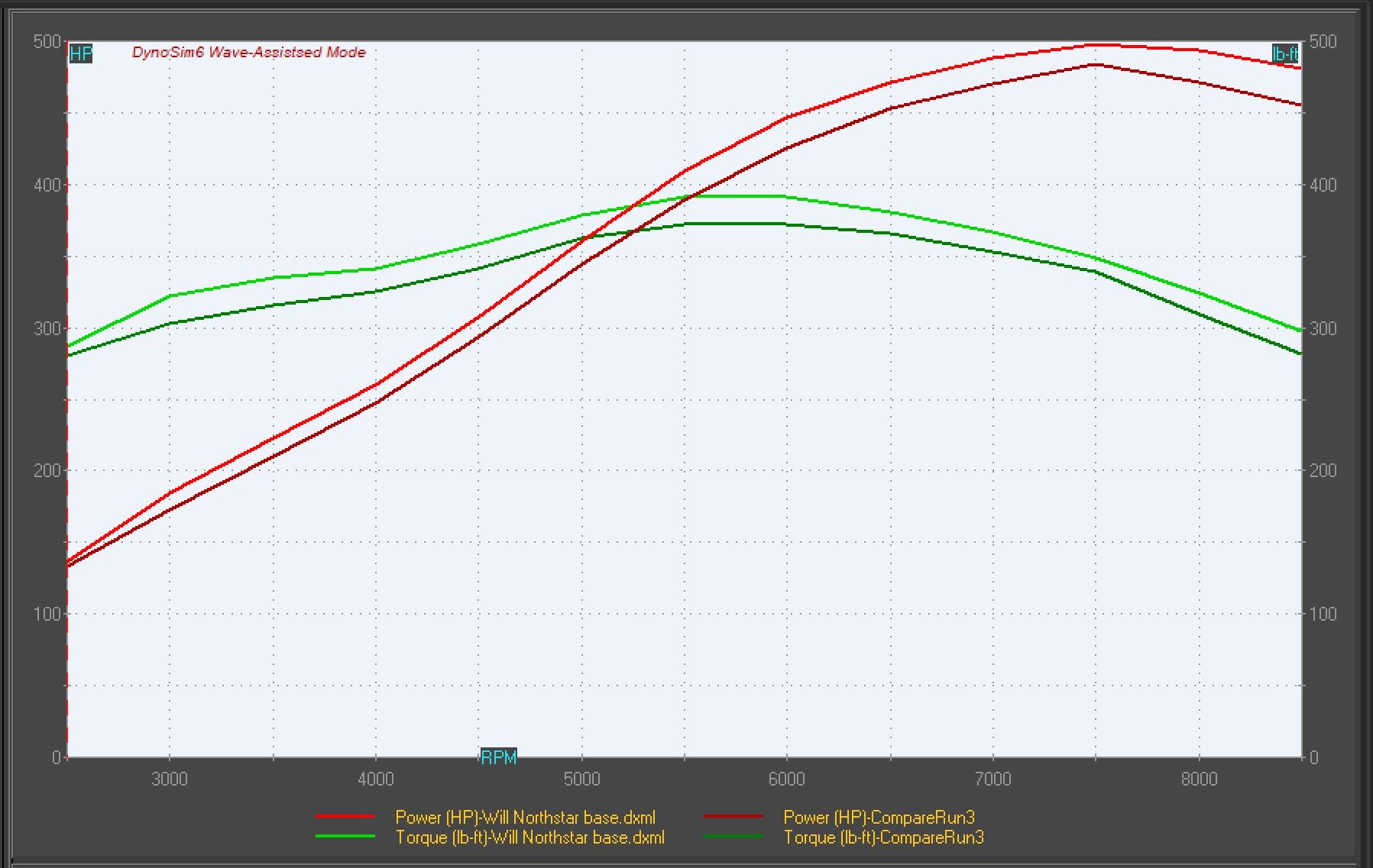 Now here is the double intake cam as the new base compared to my cams (275/287 @.006). I tried my intake as the exhaust but my exhaust does a little better, hastes my exhaust in the intake