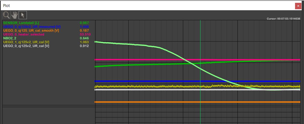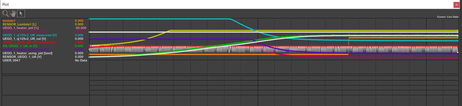 And that is where the night ended. I have readings but there is a bit more work to be done. I suspect that internally the ECU is adjusting the gain on the sensor at lambda=1 from 8 to 17 and then back to improve resolution over the range and that is causing my tuning issue...which brings me back to I don't believe the model I downloaded and have pretty heavily modified at this point ever ran a real sensor.