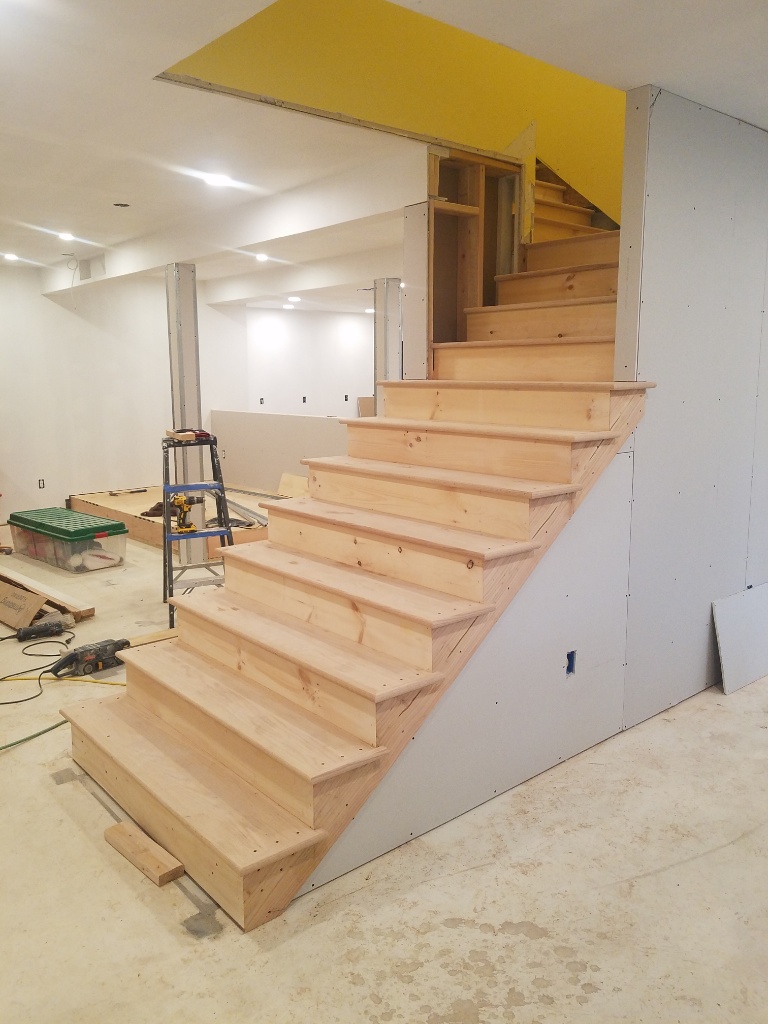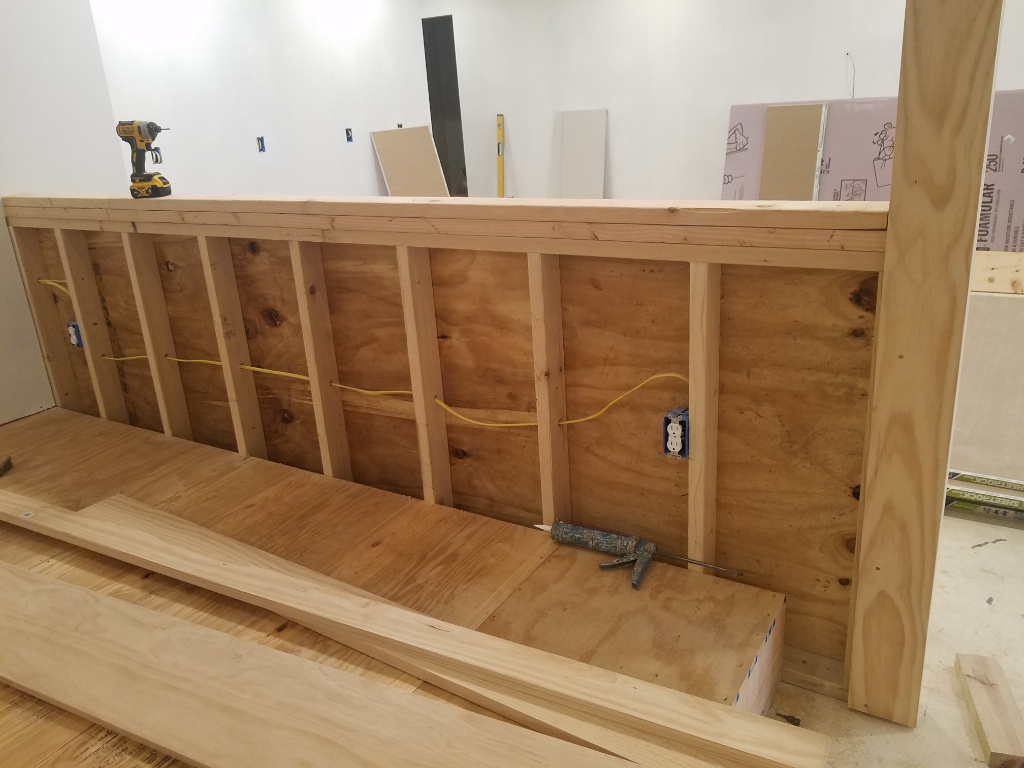 I had had everything set and was waiting on the treads so you can see in the background I build the raised platform for the theater and got the columns wrapped with drywall...after a couple days of discussion with the designer about how how exactly they were supposed to look and connect to the platform and counter wall behind.