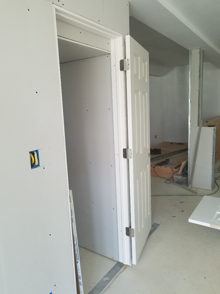 There is a closet under the stairs, the location of the door was picked early on...then moved to the side with the steel column kind of in the way so it was either a 24in door (vetoed) or a 28in with an anything but normal install...it looks normal from the outside and doesn't really look wrong inside but I JUST got it in there which all takes time to figure out and do....all because " I think it would look nicer if you don't see the closet door as you walk in, thanks". I  can't even imagine what this would be costing were I paying for labor...you know, other than the ferrari engine just sitting.
