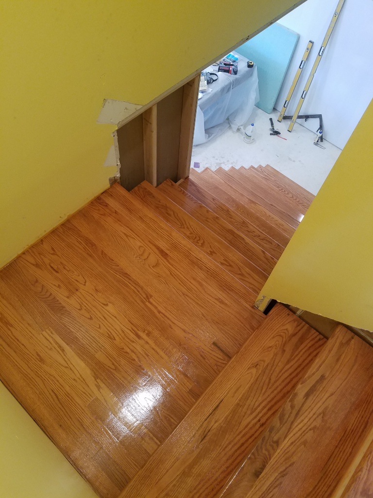 The risers and stringers are pine and will be white paint. I want to get the oak sealed now so I'm not worrying too much about about what spills on it know at worst a quick sand and topcoat and its perfect. Its also easier to not sand and paint around spindles. The painted stuff I'll leave and paint with the rest of the trim. This seems to have taken forever to get to this point but I'm hoping the pace picks up now.