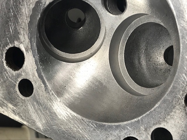 We are working on a second set of Dino heads now. Sneaking up on it. The port is really poorly shaped in the roof with very little room to move it. The exhaust angle is different and they flow very well. Anyway, we are getting there, currently we have a 28.5% increase in flow and that is not bad. I need to borrow the Dyno sim again and see where I will end up. I could let Mark do it but I would end up with a 700 HP 12,500 rpm missile I can't duplicate on my bench. Well, not for the money this project has anyway. The camera makes it look really rough. It is not that bad. Although, as I said in high school as the year book photographer, when girls complained about a picture, "The big eye don't lie!" I should touch up the guide area.