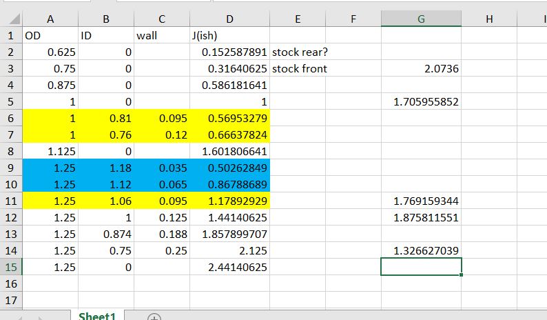 Notice its hollow though....1.25OD, .75ID making 30% more stiffness than a 1.125" bar not the nearly double a solid 1.25 would be. For sure its the stiffest I'd consider....but once the car is set up for these bars a new bar is $150 and maybe 30 minutes to install so changing my mind becomes easy.