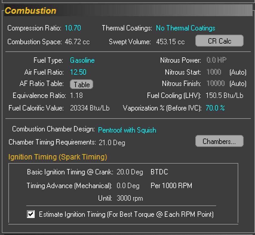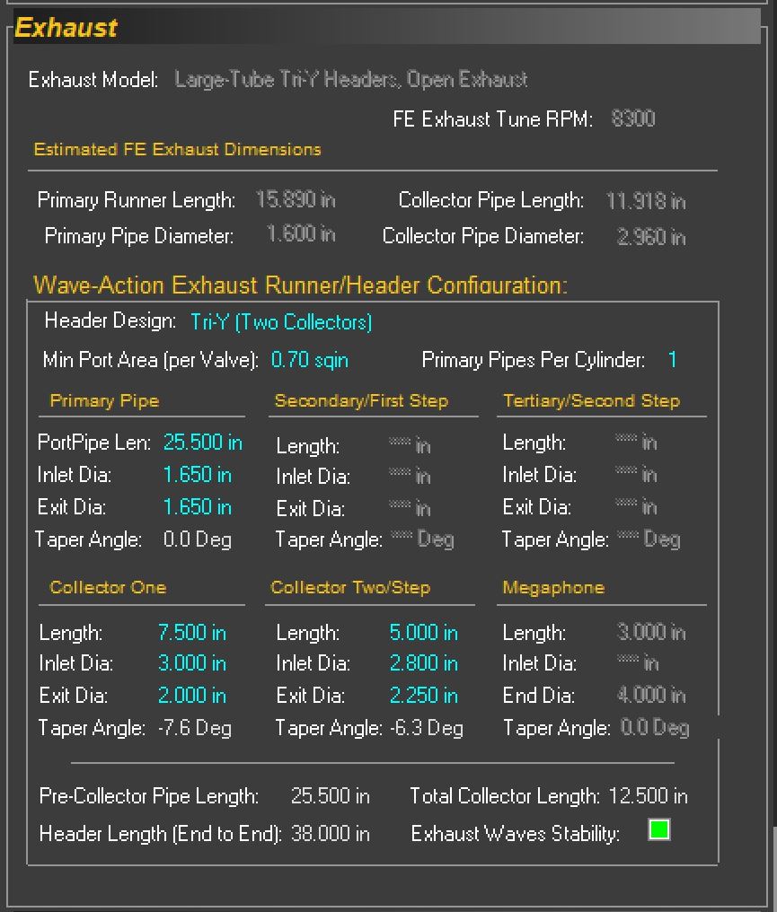 Just a couple items....the images are the screen captures for my engine so you can see what goes in the boxes. Some things are easy like bore/stroke, others are really test points like the exhaust specs cause you don't normally optimize around a specific set of headers, you play with the headers looking for what works best. If there are off the shelf cams you are considering we can approximate them from the cam card spec usually. I need valve sizes....port flow would be nice but I can approximate from the valves to baseline it. Intake style/design we need but we can look at options just like with headers.