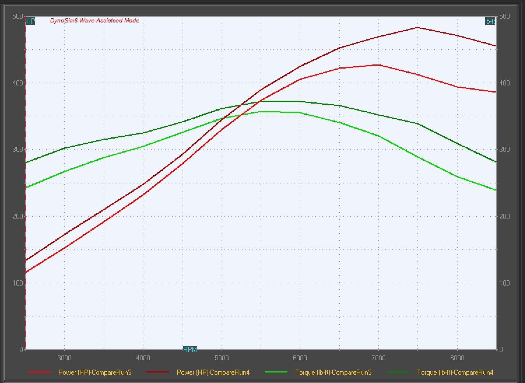 Now here is the double intake cam as the new base compared to my cams (275/287 @.006). I tried my intake as the exhaust but my exhaust does a little better, hastes my exhaust in the intake