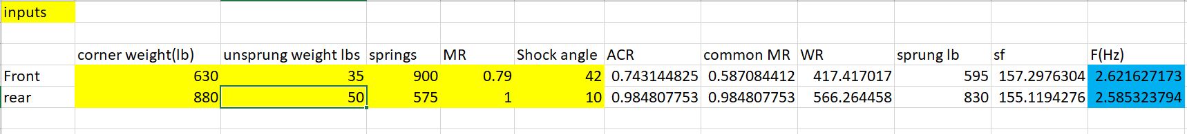 It looks like the 900 front should pair with 575 rears and yield 2.6hz which is kind or moving into downforce car territory.....but still softer than the simple sag math suggests I want. I generally prefer stiffer springs and small swaybars so I'm going to let this order roll I think.