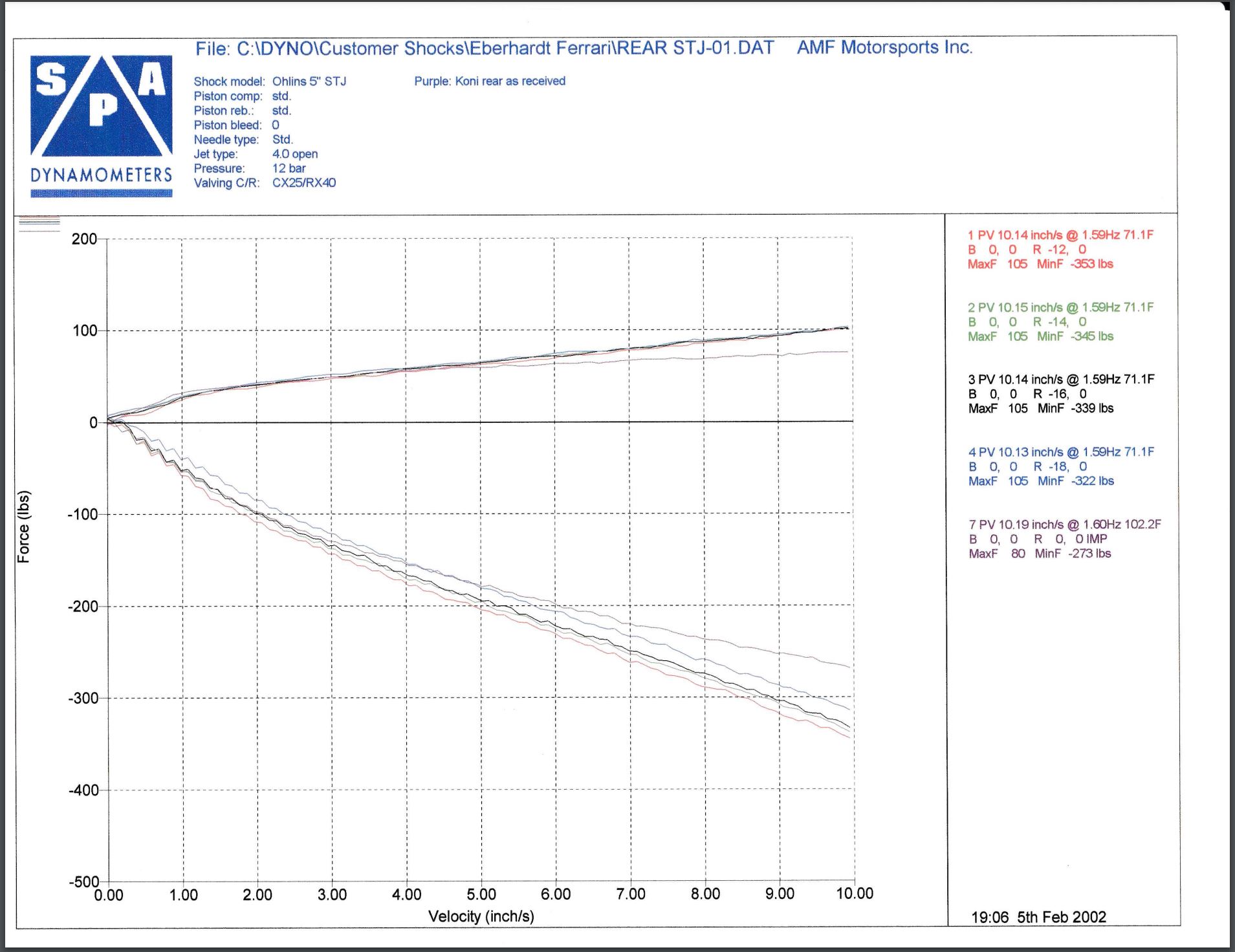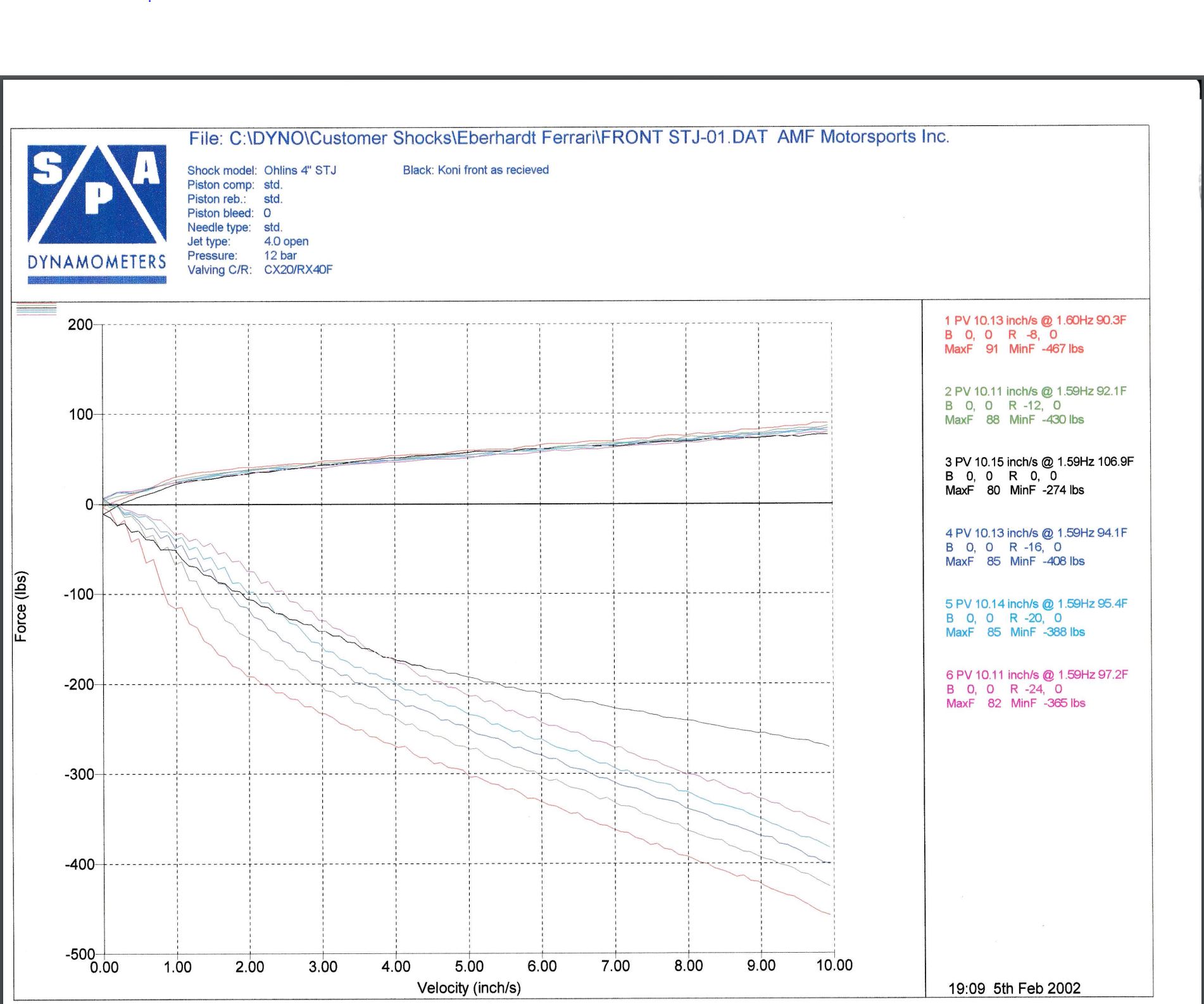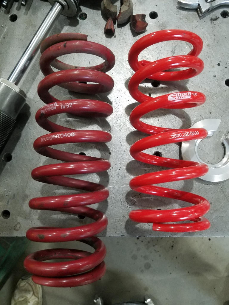 What really caught my eye here that rebound is nearly the same as compression. OEMs like about 1:3 ratio comp:rebound and my current shocks are just that as were the OEM konis which are also show on my graphs. That is a compromise for street use to let the bump move the wheel easily to make the ride feel softer but they jack up the rebound that you really don't feel as easily to help settle things. On the oem konis with the oem springs the average damping is exactly critical, meaning the system will settle with no additional oscillation.