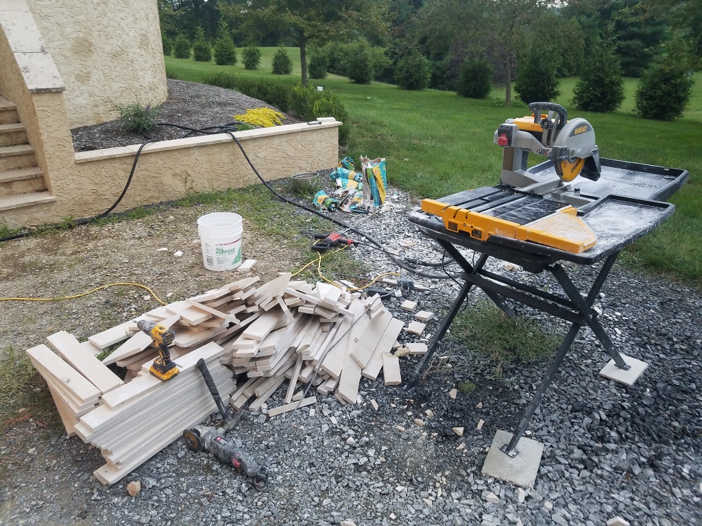 This will be the floor and wall. But they aren't going to stay 24x24, oh no! Every stone gets cut on 2 sides so they are equal size wall to wall and then floor to ceiling so roughly 18x21....and all the grout lines aligned. That means I'm going to be spending some time sawing which got me to shopping for a saw. The dewalt is nice as expected but...harbor freight is still really over what I hoped to spend.....enter craigslist again with a new in box dewalt at a less than harbor freight price. It was 2.5 hours away but.....its a nice saw.