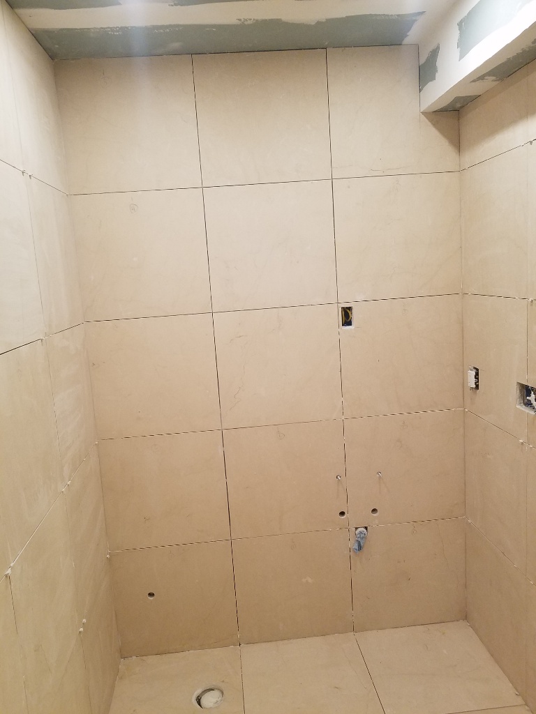 Just the one small tile over the door, the niche, and the drain has an insert that gets tiled so it kind of disappears into the floor....hopefully a couple hours and on to grout...once a color is chosen. So after about 3000lbs of stone, 600lb cements, maybe another 500lbs in backerboard my first thought was Ik glad its in the basement, the next thought was that I pity the fool who ever tries to remodel this.....then I thought maybe we should fit a steel door and call a panic room :lol: