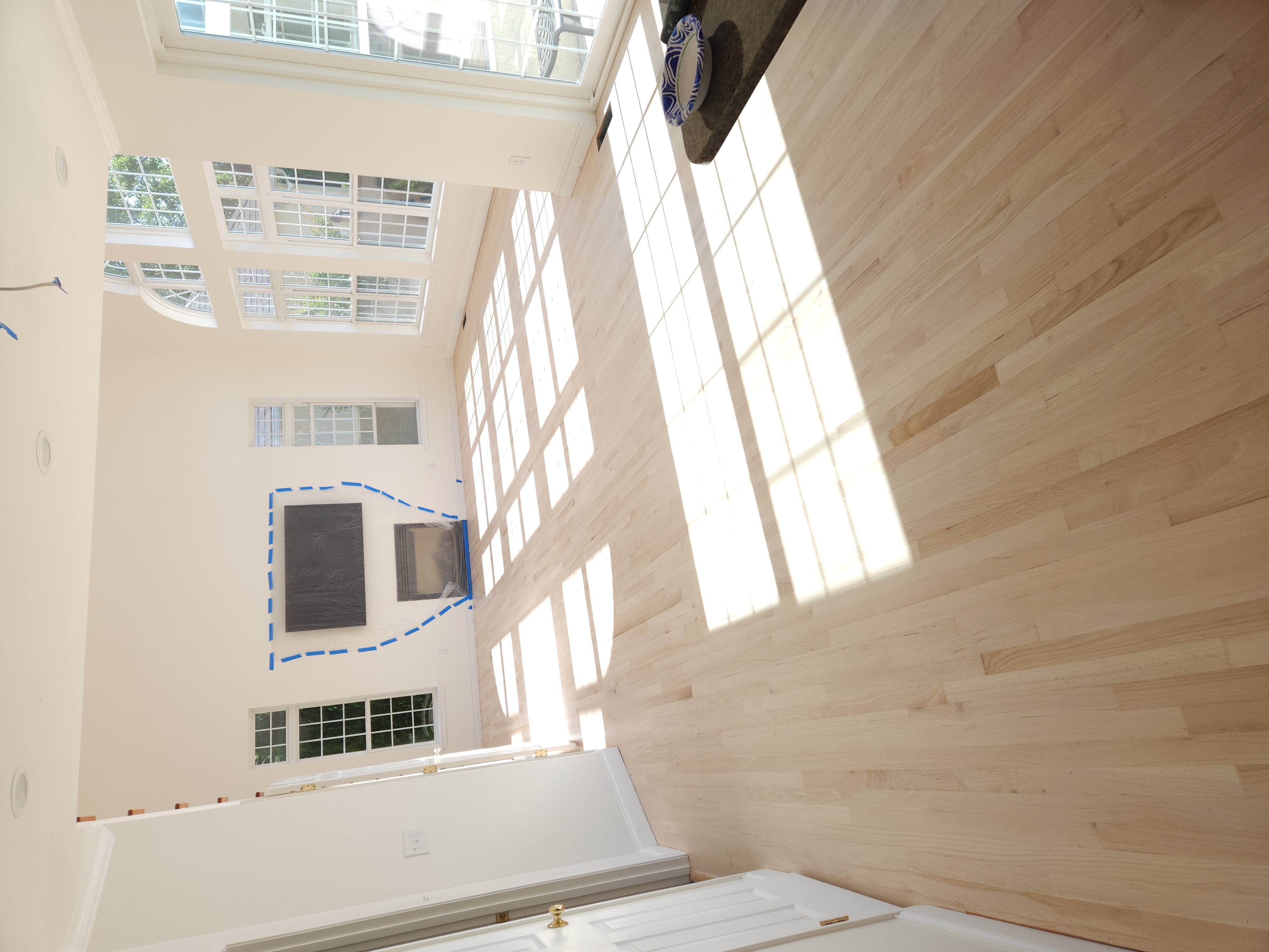 Then a defect inspection...fill anything that needs it, blend out any dings. Then 2 applications of a 2 step product (so 4 coats) called red out that gets rid of the red from the red oak. Dry 24 hours but that is a water base that raise gain so next a VERY light sand by with the 5" and 150 grit taking care not to get back into the red. Then a sealer that prevents the poly from getting into the wood and bringing up it's colors, then 2 layers of a catalyzed commercial poly (which is basically 4 coats of normal poly) with a 150 grit sand between coats and it's a "natural" floor that is anything but natural.