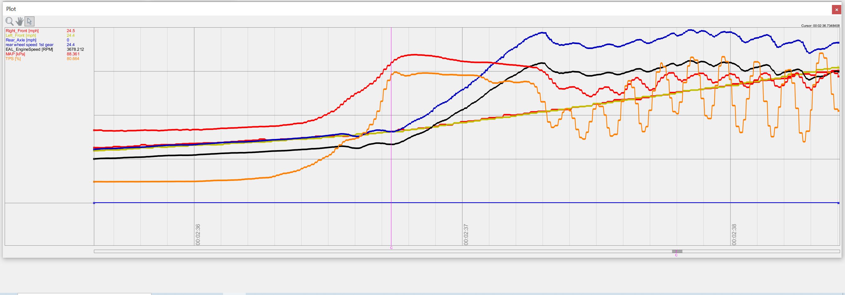 I went in to the log from the burnout and added a virtual channel for the rear wheel speed  (I don't have the sensor working but I do have rpm and I know it was 1st gear) and then made a plot with interesting stuff on it.  It looks like the tire came loose at about 3700rpm and 88kPa.  DM6 says its making 260hp/360ft-lb at that point.  That means 1st gear should be fine as long as I keep the engine below 2500rpm.  Then if I'm doing the math right, 2nd gear should hold about 523ft-lb which should be 4 ft-lbs more than the engine  can make.