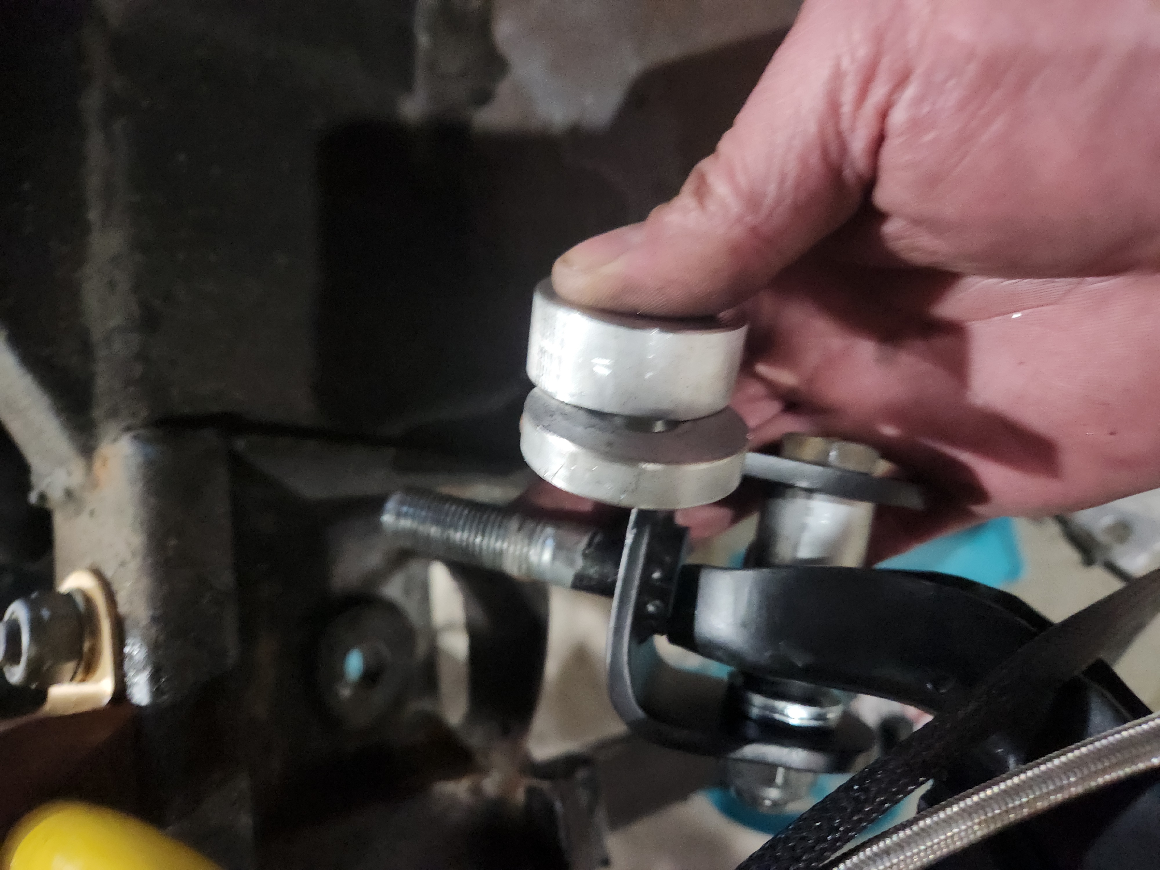 I've been kind of eyeballing the front spindles....man it sure look like they are toed out. That got me thinking about the upside-down spindld fiasco and king pin angle and.....yeah, dropping the balljoint 1.6" means i need to space out the lower aarm mount 0.28" ...my front camber spacers are too small so the couple turns i put on the tiered ends gives me toe-out. Need to fix that.