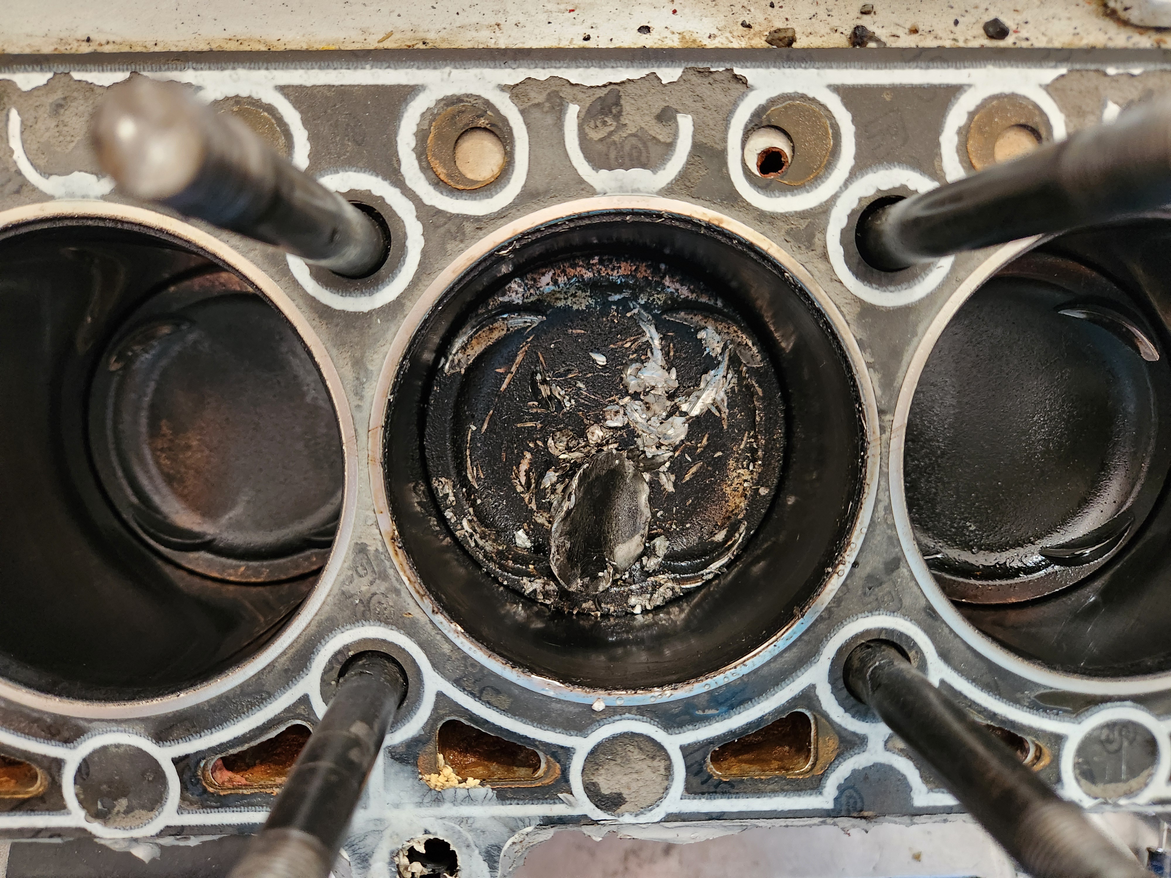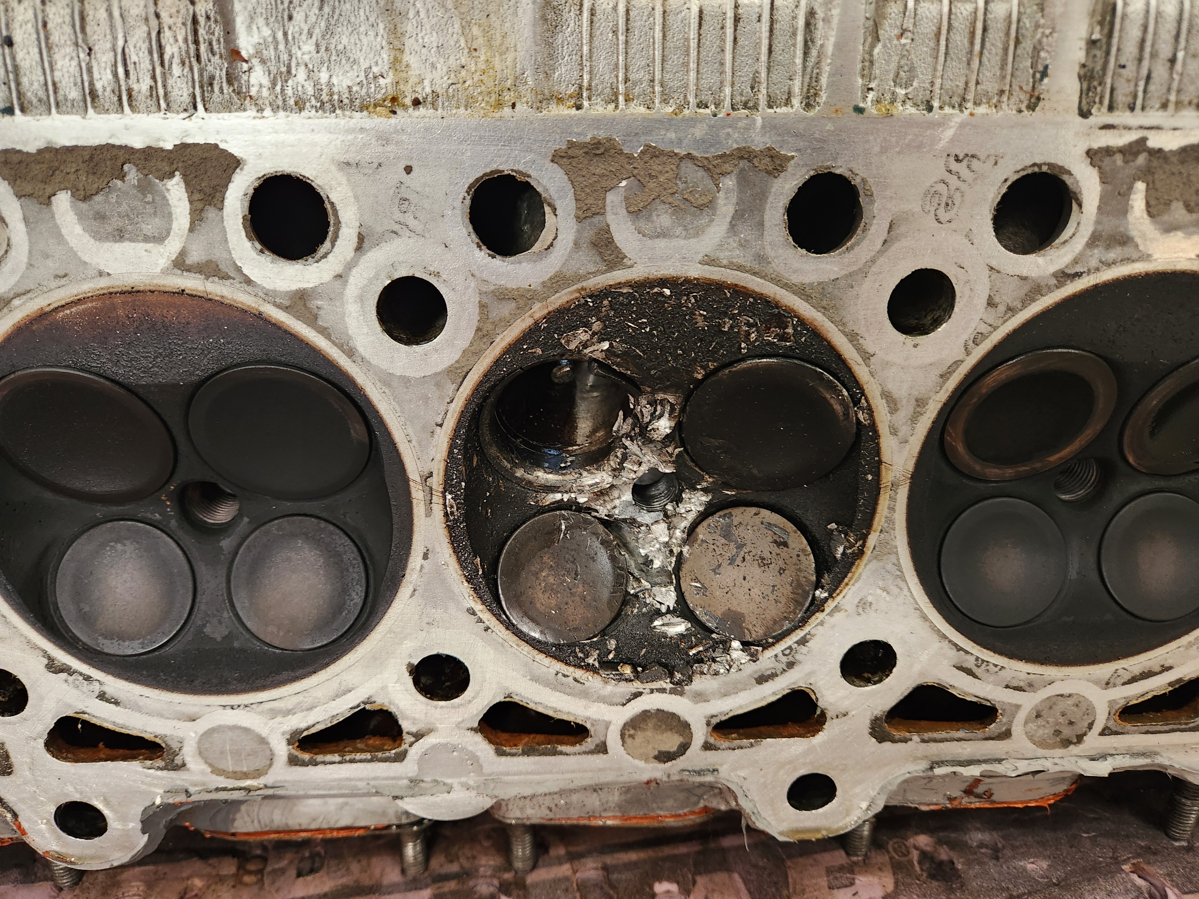 Ok.  If you look, like actually look at the head off pics you can see the intakes were hitting the pistons.  Here's a close up from the worst one in bank 2